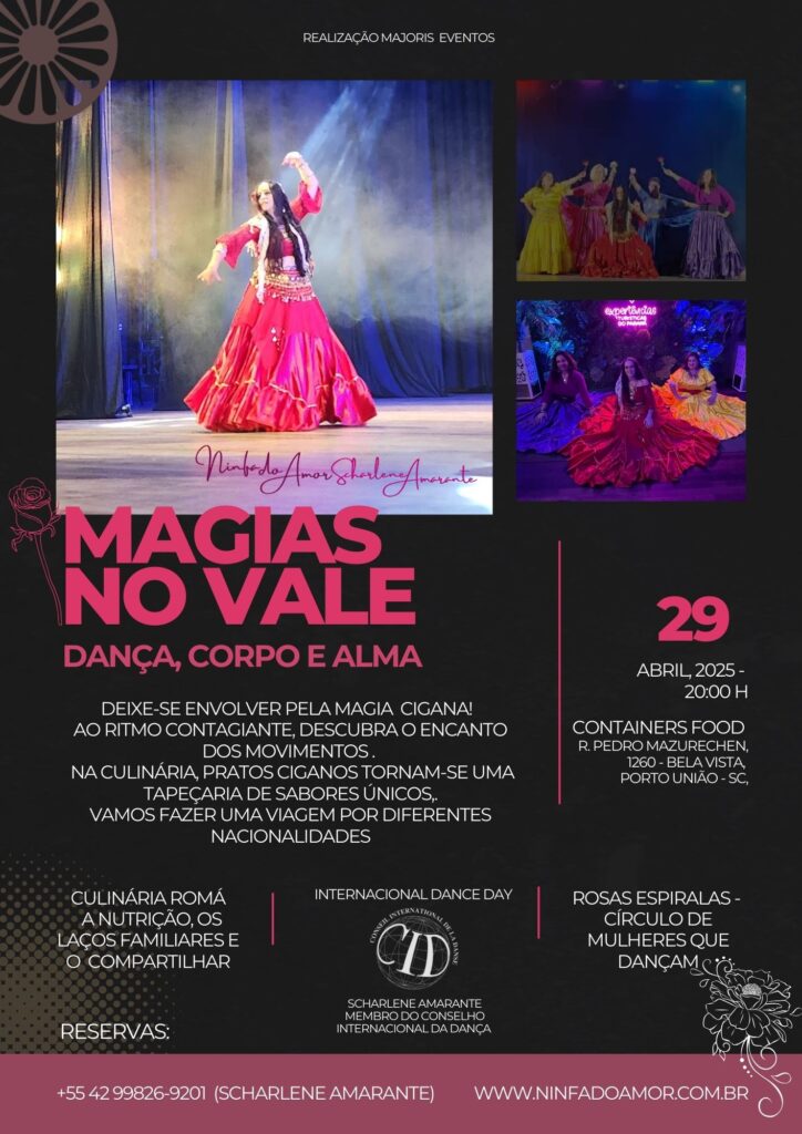 Nesse dia, os profissionais da dança organizam um evento para um público diferente do habitual e sendo assim, Scharlene Amarante resolveu unir o lançamento da experiência cultural cigana: Magias no Vale em conjunto com a celebração de 29 de Abril. Hoje a experiência turística e cultural cigana integra as experiências em cultura e história na região Sul do Paraná e Norte Catarinense. As experiências habitam nosso imaginário e Magias no Vale: Dança, Corpo e Alma vem trazendo a identidade dos povos conhecidos como “ciganos”, os Romani da etnia Romá. Originários do norte e noroeste da Índia, onde a migração se deu por ondas (diásporas) a partir do século VI por vários países do mundo e foram influenciando e deixando sua marca por onde passaram. A arte e cultura Romá tem uma grande expressão musical e dançante. A experiência será de forma leve e lúdica ao tom de uma interação de comunidade, conversando, dançando e experimentando uma comida típica, uma imersão na arte e cultura Romá a partir da busca de sua ancestralidade, conta Scharlene Amarante. O Sul e nossa região receberam imigrantes Poloneses, mas ciganos não adentravam como ciganos e sim como Poloneses. “Fui buscar me entender e lá estavam, os ciganos poloneses na raiz ancestral”.